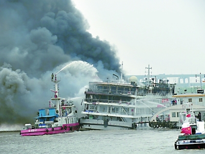 昨日上午12时30分,记者达到天兴洲大桥下天兴洲匝道处,因路没通,步行1小时后才到距失火船只不敷10米的江边。该船有四层,船名“长江参观7”,停靠在离天兴洲大桥约200米的汉口江畔,船头朝天兴洲大桥,向岸边倾斜。船上四处冒烟,二、三、四层不时看到火光,消防车停在拖船上,部门消防官兵借助拖船施救,另一部门人上船救助。相近江面已被封闭,失火的旅游船四周,有前来救助的水上公安快艇、中国海事船。