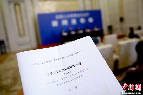 4月25日,十二届全国人大常委会第二次会议闭幕后,全国人大常委会办公厅召开新闻发布会,有关方面负责人就本次会议表决通过的《中华人民共和国旅游法》相关问题回答记者提问。中新社发 杜洋 摄