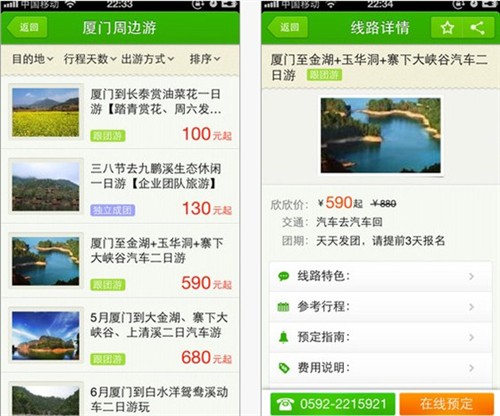 而差异于以上的无线旅游应用, 海内最大的在线旅游超市——欣欣旅游网开拓出一种以旅游线路预订为打破点的APP,其几个线路预定成果主要分类为:周边游、海内游、出境游、目标地旅游等;旅客可以凭据本身的出行需求,进入相对应的页面举办查询预定。