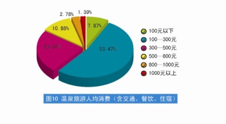 在温泉旅游消费程度观测中显示,高出半数的旅游者接管300元以内的温泉旅游人均消费(含交通、餐饮、住宿)。