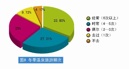 在受访人群中,有33.8%的人常常去温泉,时常去温泉的人占27.3%,去过和偶然去的人占34.72%。可以看到,受访人群中高出95%的人在这个季候有过温泉旅游的经验。在温泉旅游的诸多要素中,最受旅游者存眷的是卫生条件,水质和设施环境位居二、三。