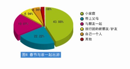 “春节出游与谁在一起”的观测功效显示,家庭出游占据了最大的比例,个中小家庭出游的比例43.98%,更有22.22%的人选择带上怙恃。与伴侣一起旅游的靠近五分之一,比例为19.91%,也有高出14%的人在春节大假的出游中选择独自旅行或在旅游中结识新伴侣。