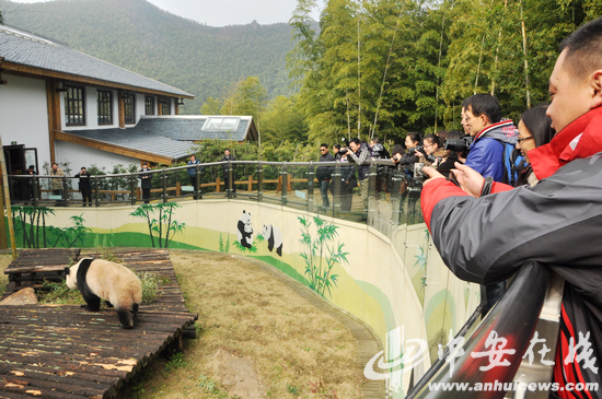 网媒记者在天目湖景区被卖萌的熊猫吸引