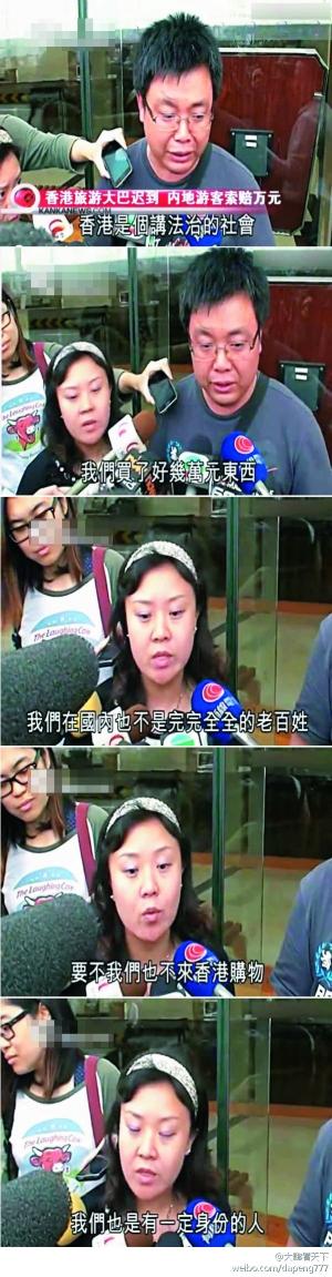 要求抵偿的一家四口来自辽宁,包罗一对佳偶、1名小孩及1名年约60岁的老妇。个中哭诉的男团员姓郑,年约40岁,自称是内陆公事员,他直言“心里很是不舒服”,又指香港是法治社会,旅行社的行为“完全是欺诈”,品评旅行社要他们守时本身却不守时。而其老婆则面临镜头说:“我们也不是完完全全的老黎民,我们也是有必然身份的人,否则不会来香港购物。”