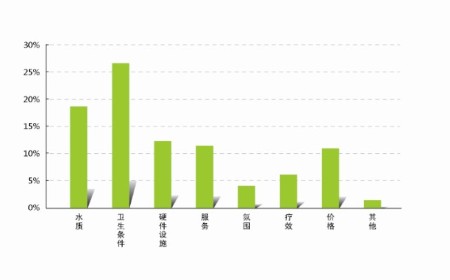在受访人群中,有33.8%的人常常去温泉,时常去温泉的人占27.3%,去过和偶然去的人占34.72%。可以看到,受访人群中高出95%的人在这个季候有过温泉旅游的经验。在温泉旅游的诸多要素中,最受旅游者存眷的是卫生条件,水质和设施环境位居二、三。