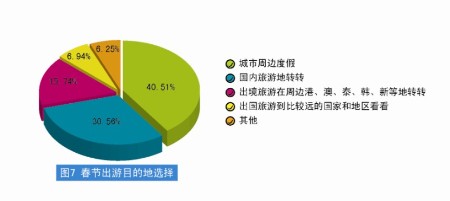 观测功效显示,都市周边是春节旅游度假最主要的选择(40.51%),海内旅游中的中程旅游目标地选择占受访人群的(30.56%),有高出五分之一的人群选择出境旅游,个中选择在周边国度和地域旅游的占(15.74%),去较远国度和地域的占(6.94%)。