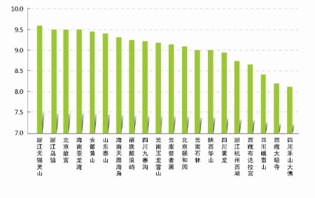 景区综合评价排名是按照网民对游览、交通、旅行社处事、旅游线路、住宿餐饮、休闲购物、卫生与安详、旅游从颐魅者状况、旅游咨询业处事、知名度等十个方面的评价(从1分到10分),综合平均得出景区处事综合评价。本季综合评价最高的前20大景区如下所示: