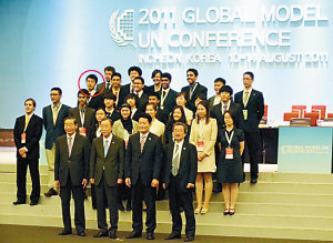 2011年韩国模联,王功宝(红圈处)与潘基文等合影(受访者供图)。