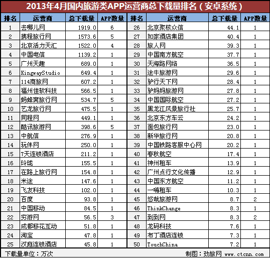 近日,劲旅网独家发布的国内旅游应用(APP)市场监测月度报告,引起了各界广泛关注,在此基础上,劲旅网又对旅游类APP运营商所运营的所有客户端产品的总下载量进行了汇总排名,结果显示,国内旅游类APP运营商总下载量排名前十位的依次是:去哪儿网、携程旅行网、北京市活力天汇科技有限公司、中国电信、广州天趣网络科技有限公司、KingwayStudio、114商旅网、福州佳软科技网络有限公司、蚂蜂窝旅行网、艺龙旅行网。